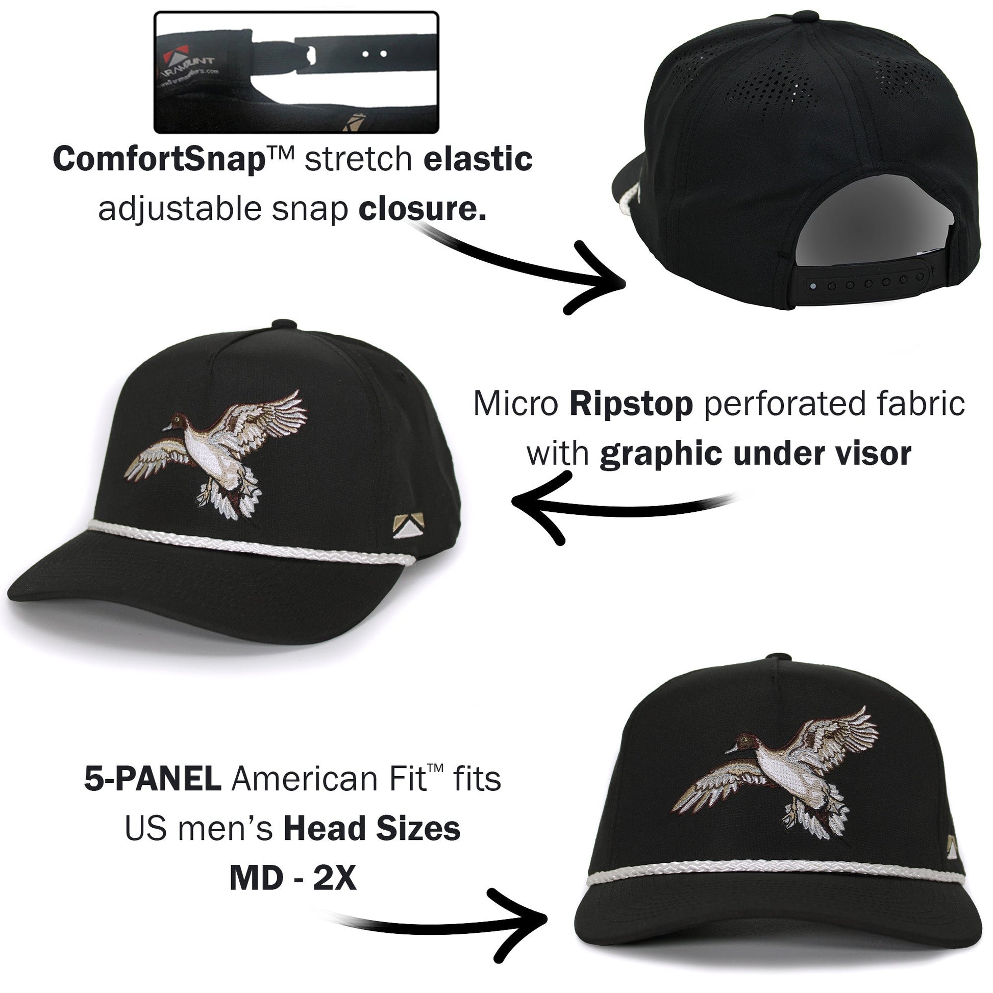 The black pintail waterfowl duck hunting 5-panel trucker hat features ultra lightweight micro-ripstop fabric. Coupled with a trucker style structured front panel featuring a detail pintail duck embroidery. Additionally, features our COMFORT SNAP elastic closure which couples the stretch fit of a custom cap with the adjustability of a snapback. Lastly, this duck hunting cap rope cap features American Fit sizing which fits men's head sizes MD - XX.