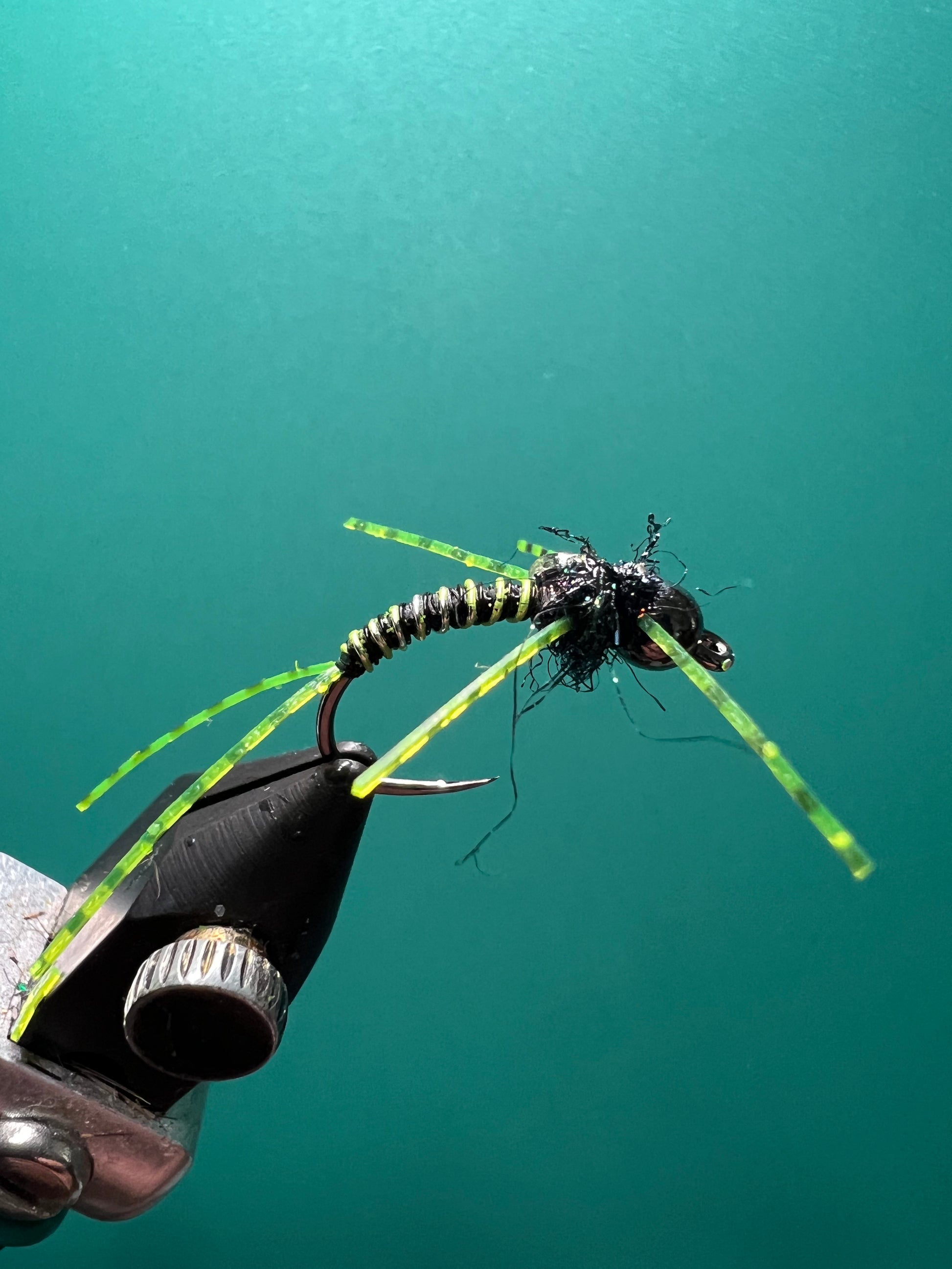 Copper John Rubber Legs tied on a #8 Curved Nymph hook with a Tungsten Bead and Rubber Legs!