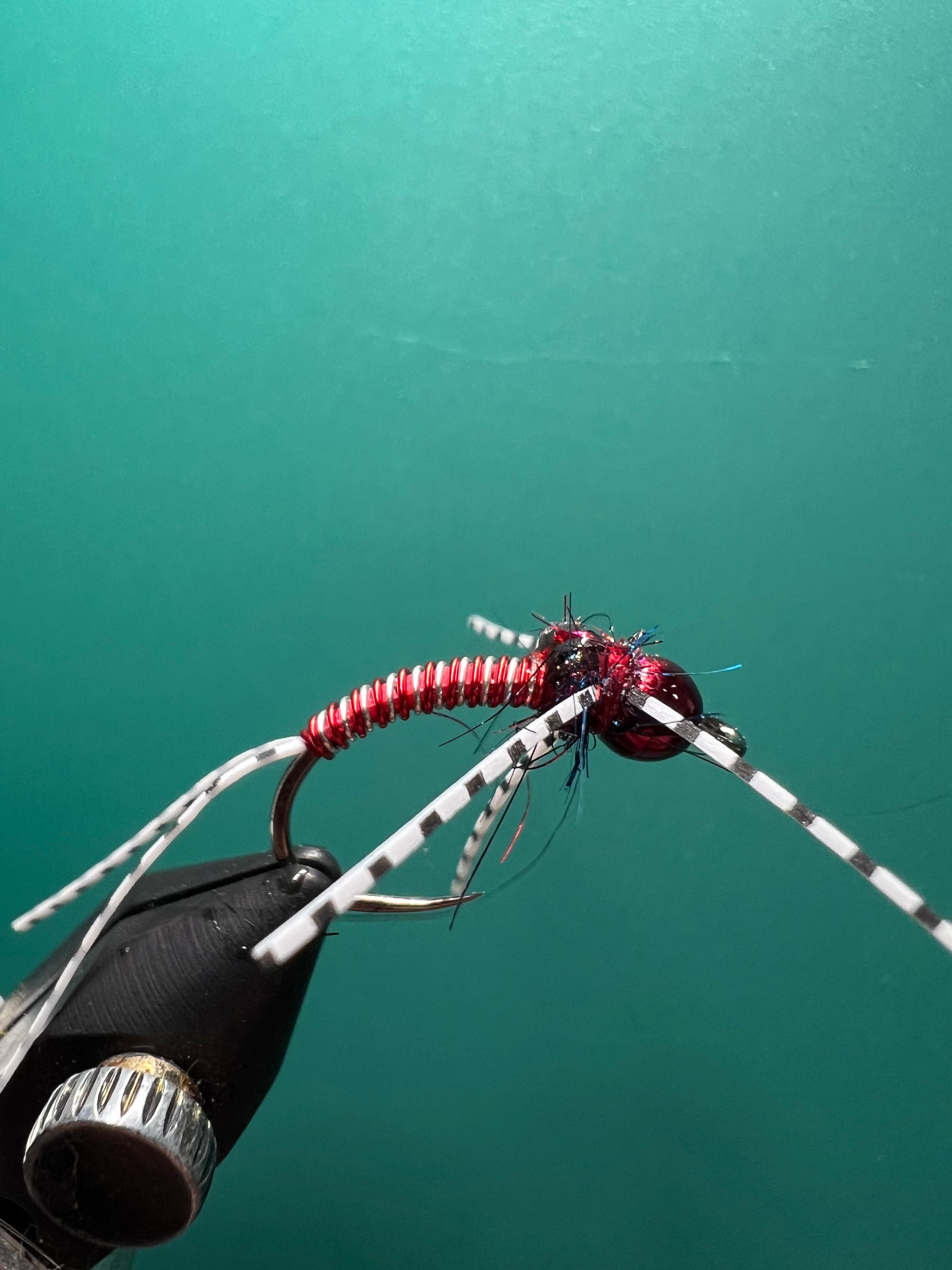 Copper John Rubber Legs tied on a #8 Curved Nymph hook with a Tungsten Bead and Rubber Legs!