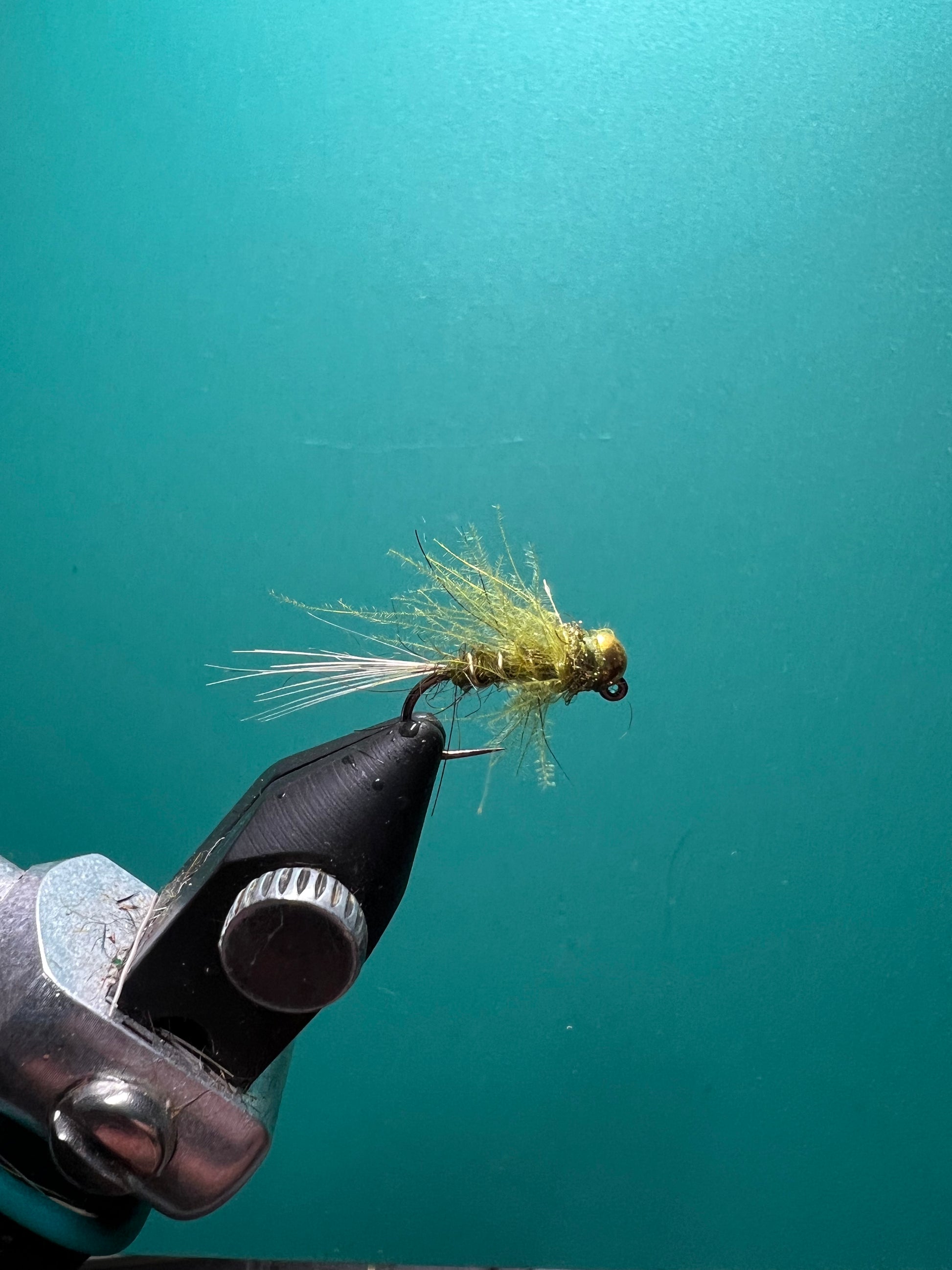 Dark Olive and Gold Euro Nymph tied with a CDC Collar and Gold tungsten bead!