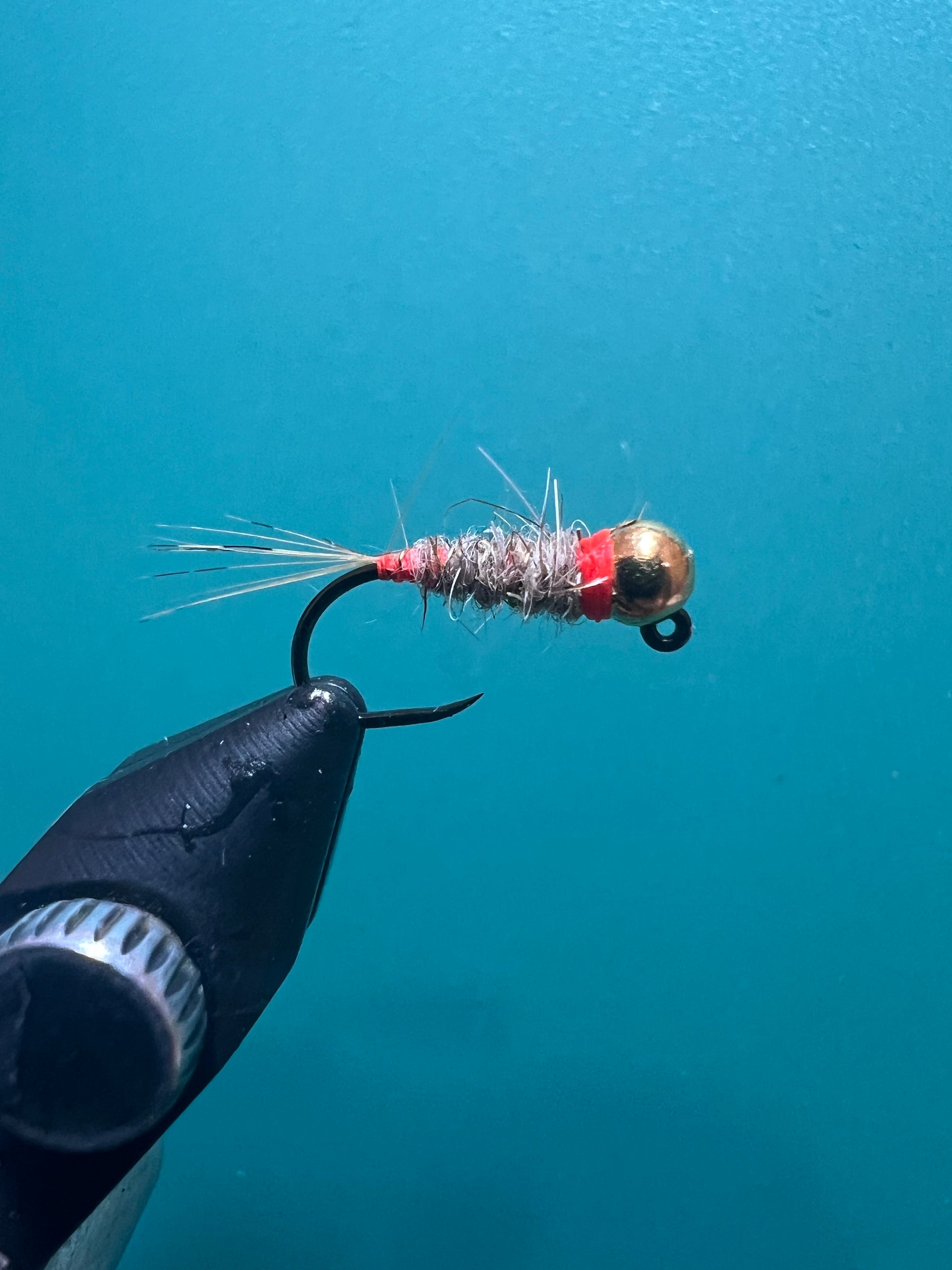 This variation of the classic Hare's Ear sports a nice Fire Orange hotspot on the tail. Ribbed with gold wire and topped off with a gold tungsten bead to help get down in the water column.