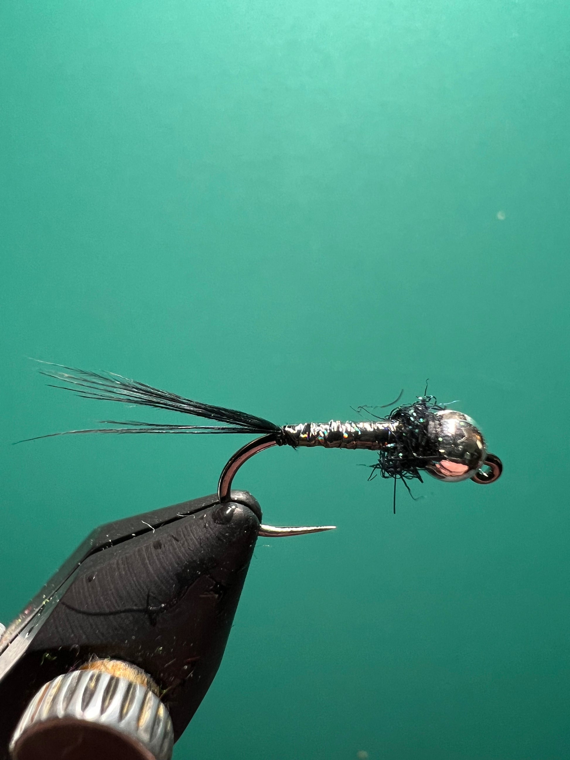 Black Holo Rainbow Warrior variation tied on a Jig Hook with Tungsten Beads. Great addition to your Euro arsenal.