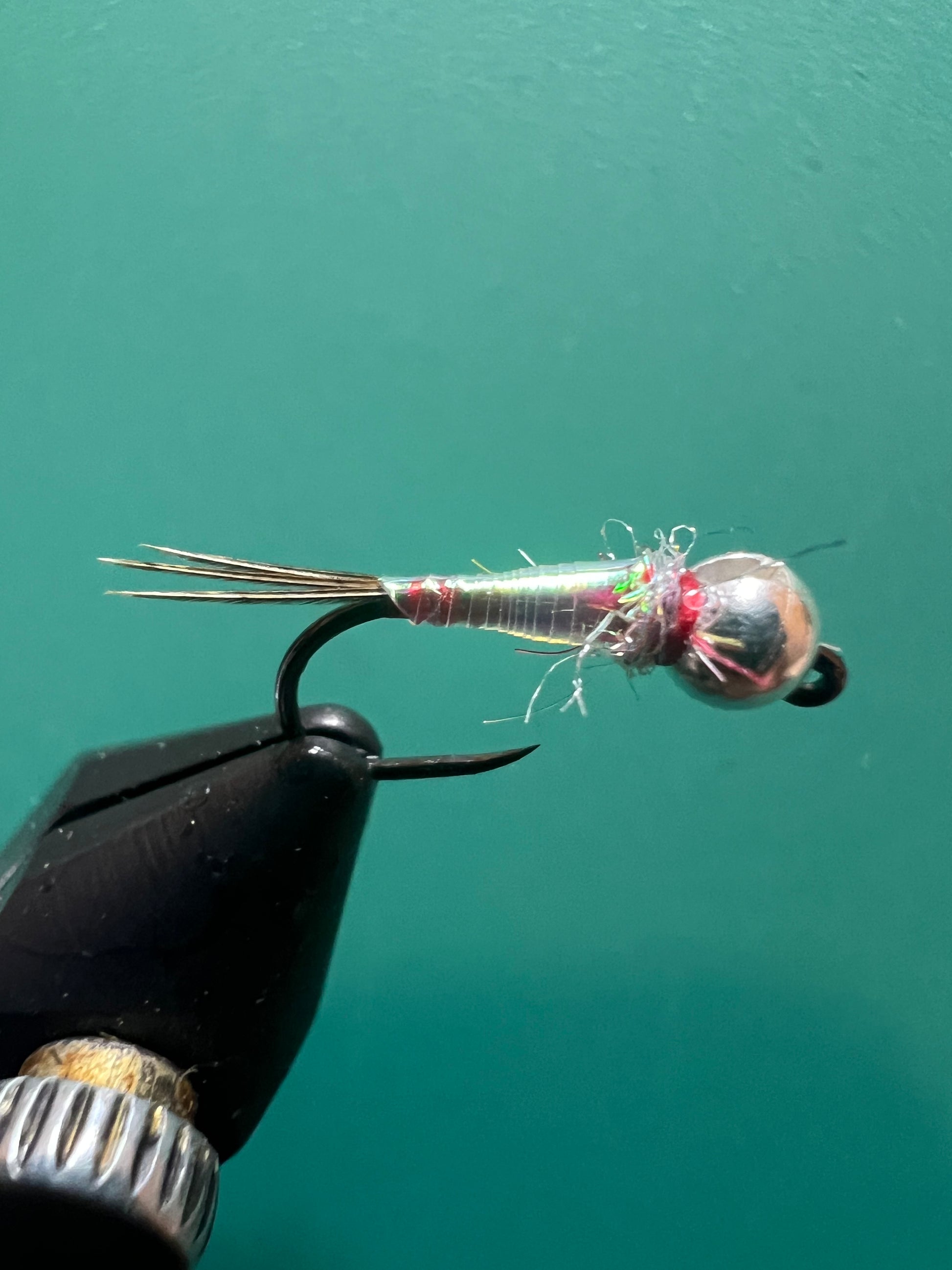 Pearl Rainbow Warrior variation tied on a Jig Hook with Tungsten Beads. Great addition to your Euro arsenal.