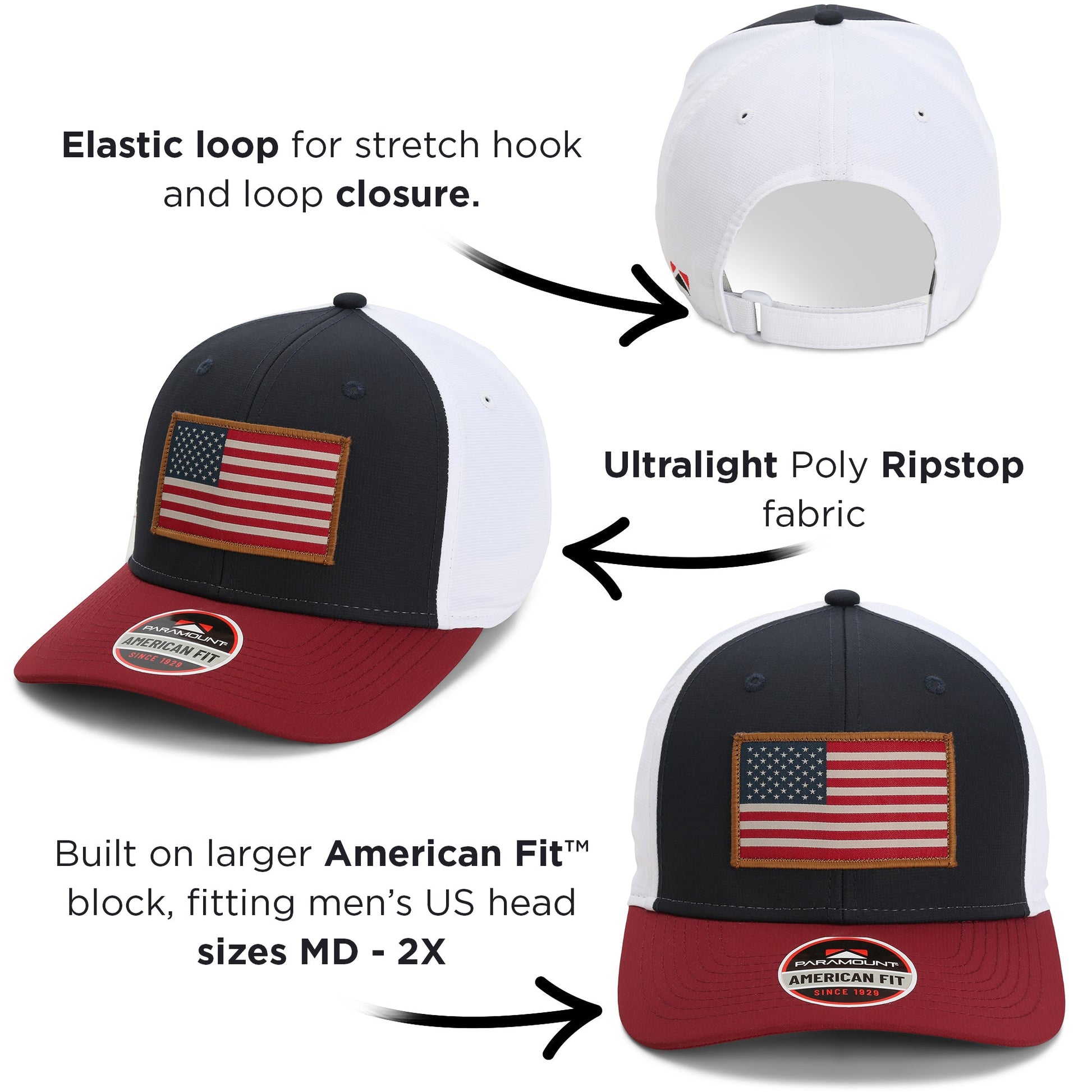 This Riverside 6-Panel American Flag Hat features our lightweight performance polyester ripstop fabric with structured front panels. Coupled with our American Fit™ design, fitting US heads sizes MD - 2X. Traditional caps only fit sizes SM - XL. American Fit™ sizing is a throw back to the original American size standard established in 1929. Lastly, the hook and loop rear closure features an elastic loop for a comfortable stretch fit. Patriot Series American Flag Cap